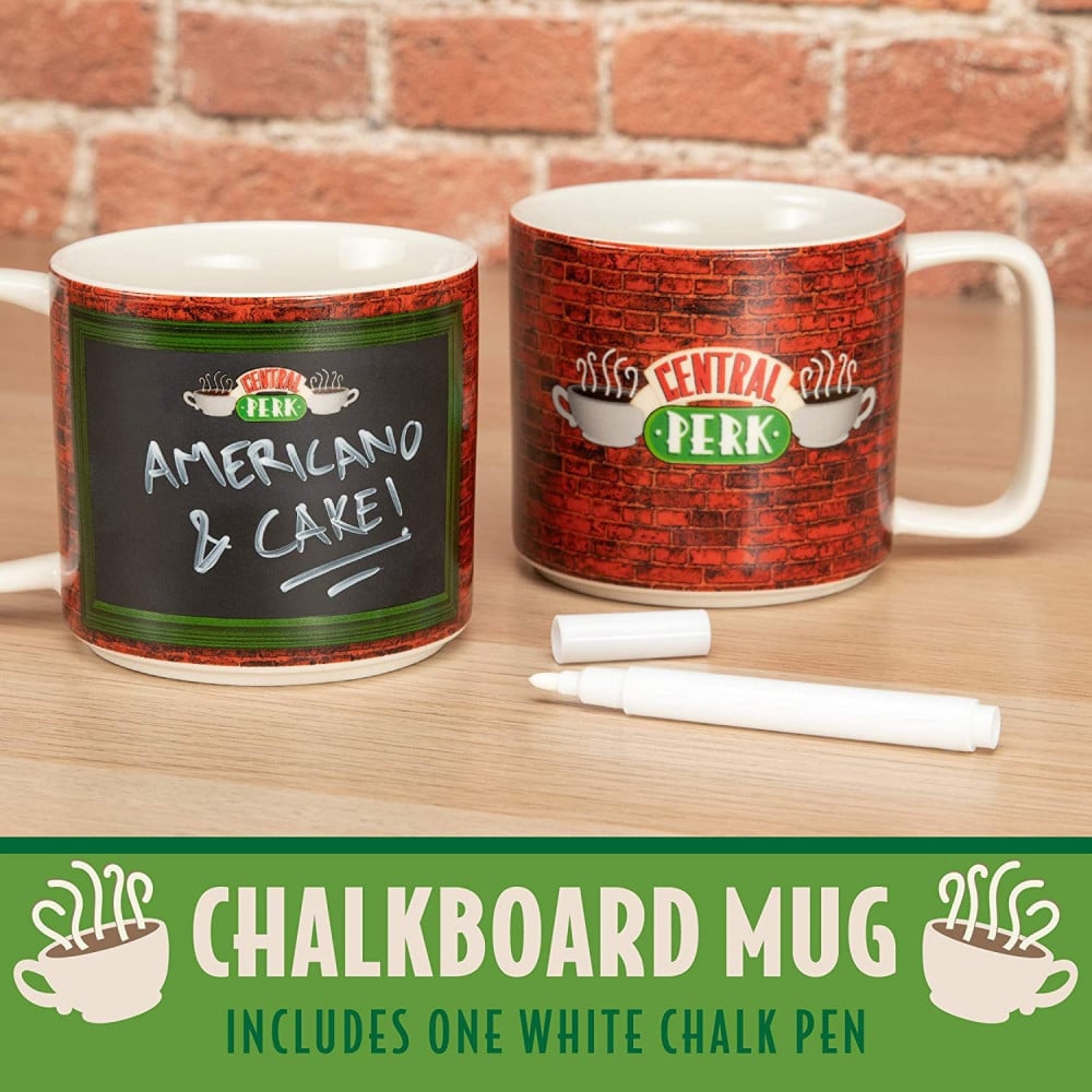 Bring a slice of Manhattan to your life with this awesome Central Perk Chalkboard Mug. You can chalk a drink order or message onto the chalkboard area that has been lovingly reproduced to resemble the menu board that hung on the wall in the Central Perk coffee shop. Turn the mug around and you will find the Central Perk logo that will be instantly recognisable to anyone who enjoyed the outstanding comedy series Friends. A great, practical piece of memorabilia supplied in a full-colour gift box with a chalk pen.